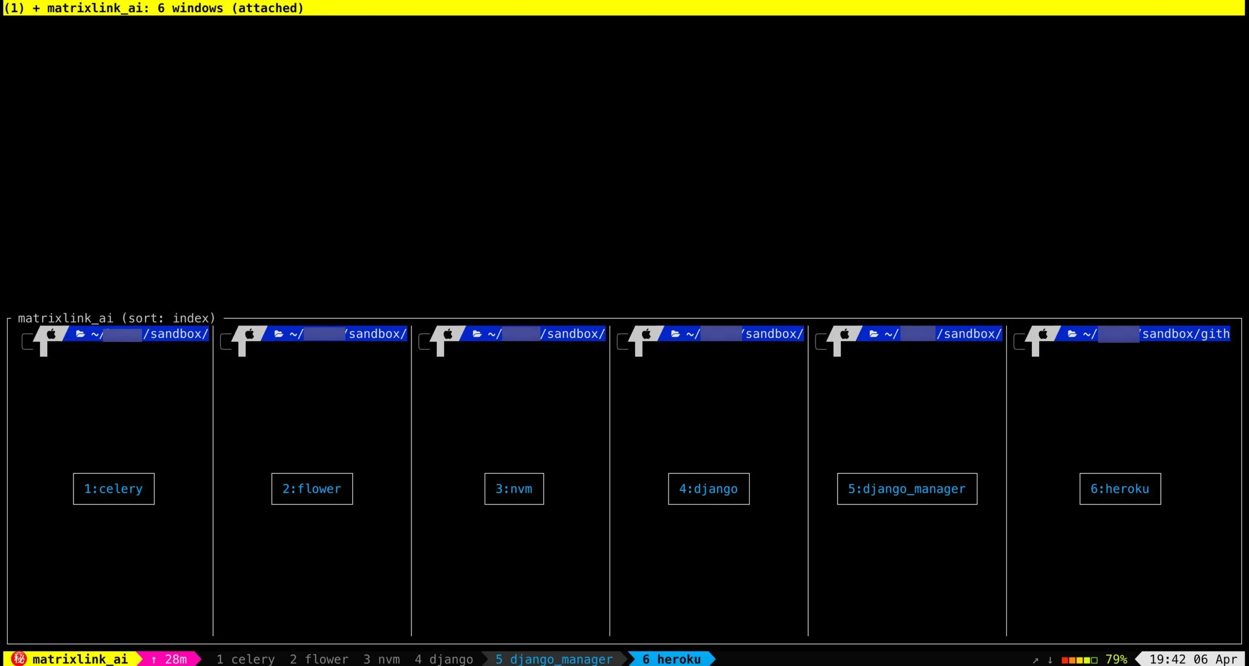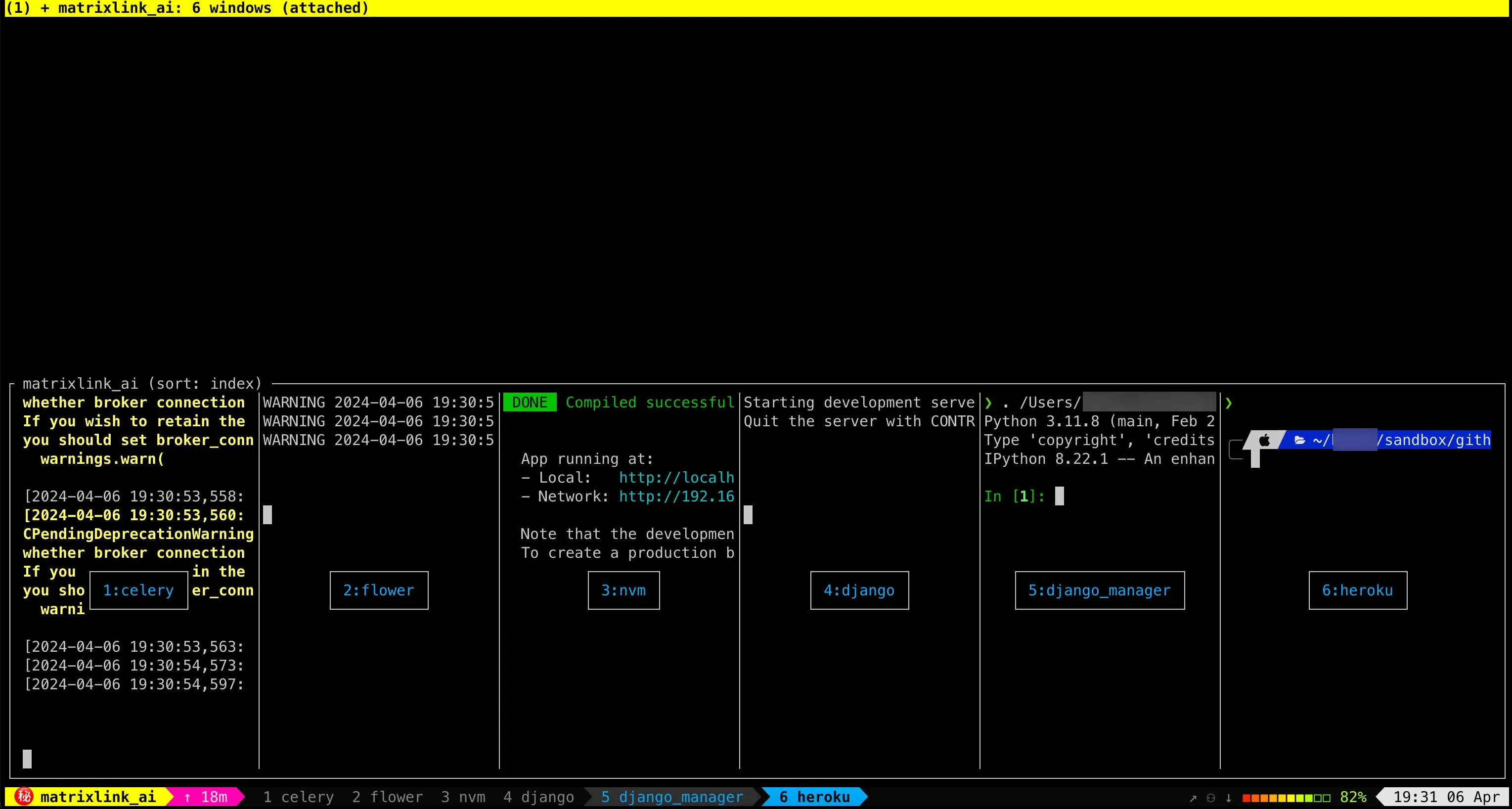 To streamline my Django development, I typically open six tmux windows 😎 :