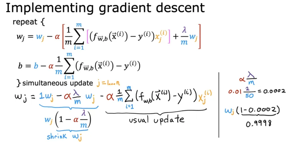 c. Regularization - reduce size of parameters - Encourage the learning algorithm to shrink the values of the parameters without necessarily demanding that the parameter is set to exactly 0. -