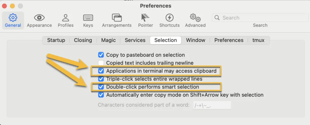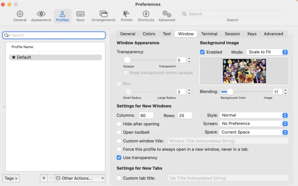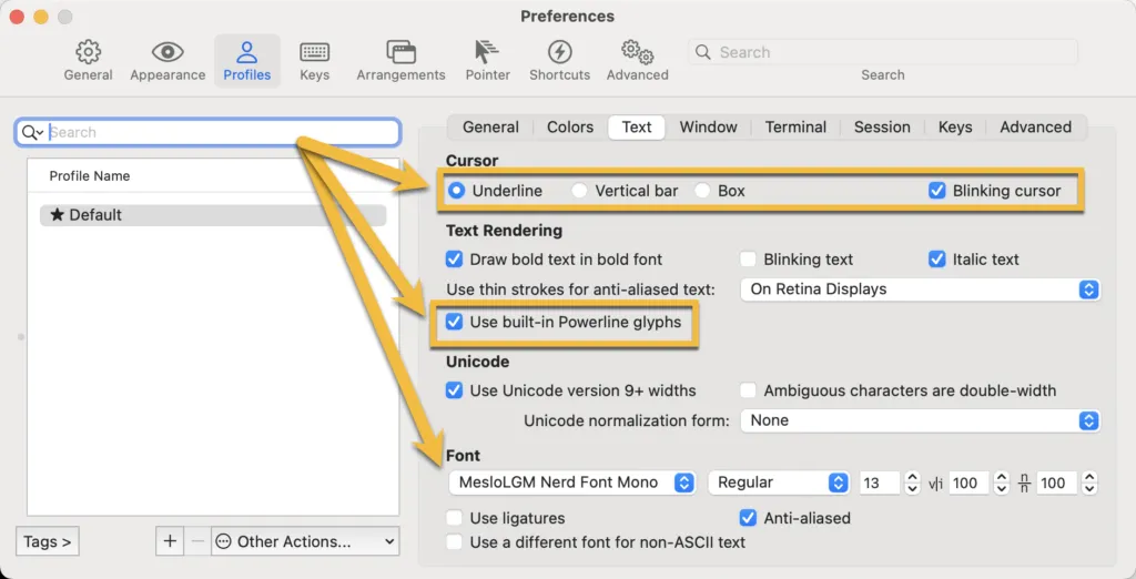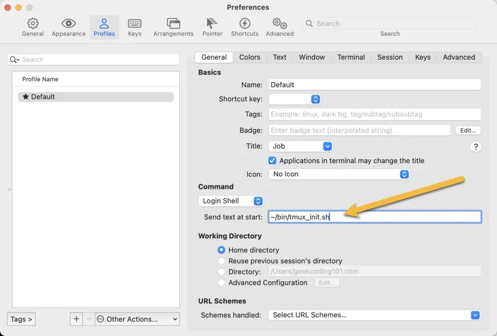 if [[ $? != 0 ]] ; then tmux attach -t kongfu || tmux new-session -s kongfuelse echo "********************************************************************************" echo "* Ignore attaching tmux kongfu session as it has been attached already. *" echo "********************************************************************************"fiSave it “~/bin/tmux_init.sh” and “chmod 755 ~/bin/tmux_init.sh”, configure it in iTerm2 default profile: