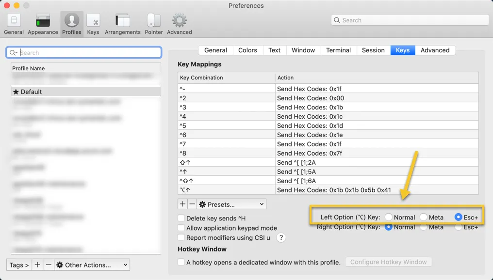 Prefix (Control + B) + w, it will list all windows. Each entry it has a shortcut. You might notice that, after0~9, it started withM, likeM-i. TheMmeansMeta Key. In iTerm2, you need to set it. I’ve set it as below: